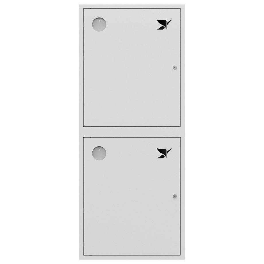 Снабжен глухими дверцами без смотровых окон с почтовыми замками и карманами для хранения ключей. Окрашен прочным полимерным покрытием белого цвета.