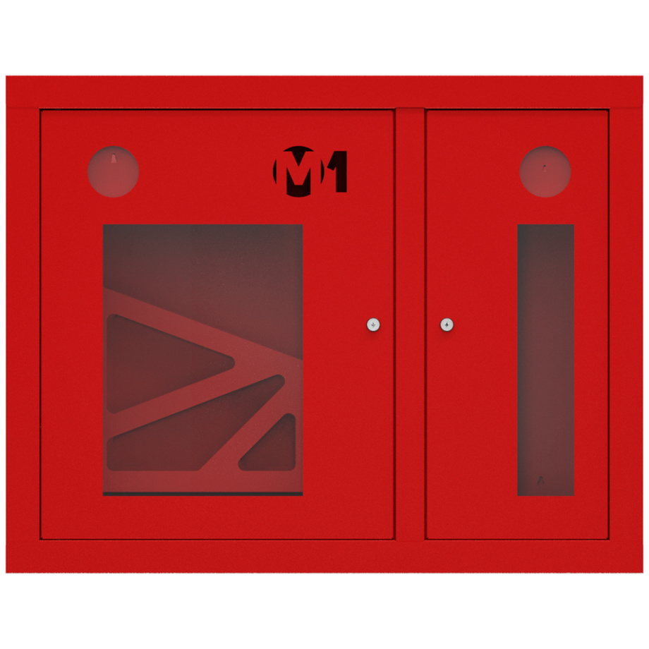 Шкаф комплектуется поворотной корзиной (рукавной кассетой) для одного напорного рукава диаметром от 50 до 66 мм. Снабжен дверцами со смотровым окном с почтовыми замками и карманами для хранения ключей. Окрашен прочным полимерным покрытием красного цвета. Толщина металла 0,6 мм.