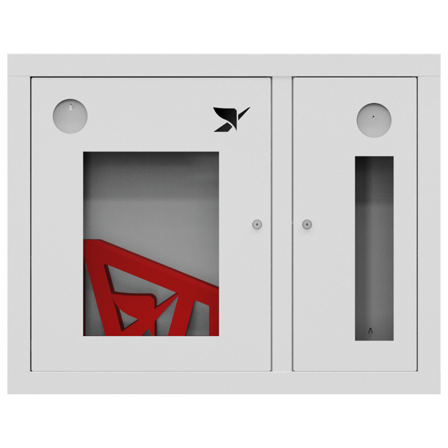 Шкаф комплектуется поворотной корзиной (рукавной кассетой) для одного напорного рукава диаметром от 50 до 66 мм. Снабжен дверцами со смотровым окном с почтовыми замками и карманами для хранения ключей. Окрашен прочным полимерным покрытием белого цвета.