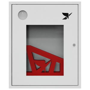 Шкаф комплектуется поворотной корзиной (рукавной кассетой) для одного напорного рукава диаметром от 50 до 66 мм. Снабжен дверцей со смотровым окном с почтовым замком и карманом для хранения ключей. Окрашен прочным полимерным покрытием белого цвета.