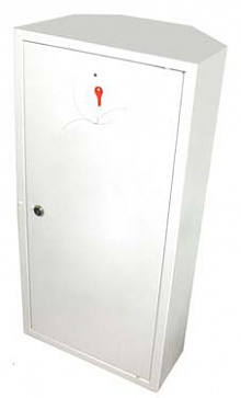 На металлический корпус шкафа, выполненного в виде короба, навешивается глухая дверца, оборудованная замком. На дверце имеется место для запасного ключа, защищенное стеклом.