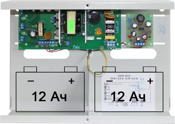 Скат -2412 (24 В/2,5 А; 12 В/0,5 А в режиме резерва до 2,5 А, отсек под АКБ 2штх12В, 12Ач)