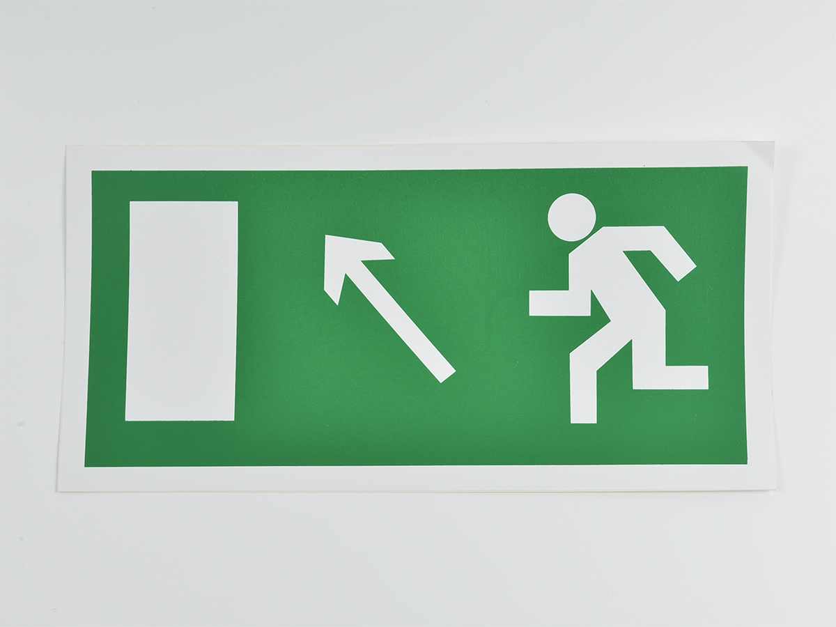 Самоклеящаяся наклейка E06 "Направление к выходу налево вверх" используется на стенах помещений для указания направления движения к эвакуационному выходу по наклонной плоскости (используется совместно с другими знаками пожарной безопасности).