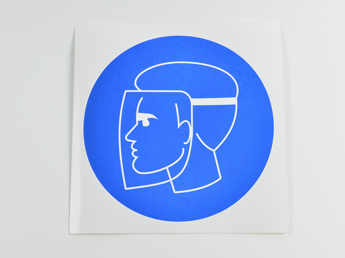 Самоклеящаяся наклейка M08 "Работать в защитном щитке" используется на рабочих местах и участках, где необходима защита лица и органов зрения (используется совместно с другими знаками пожарной безопасности).
