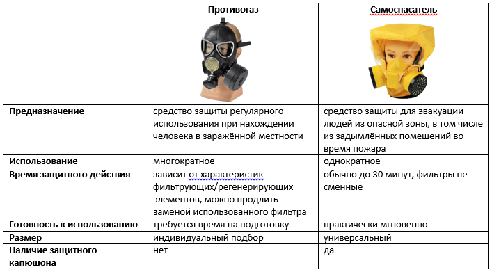 - Противогаз можно использовать многократно, самоспасатель – средство однократного применения.